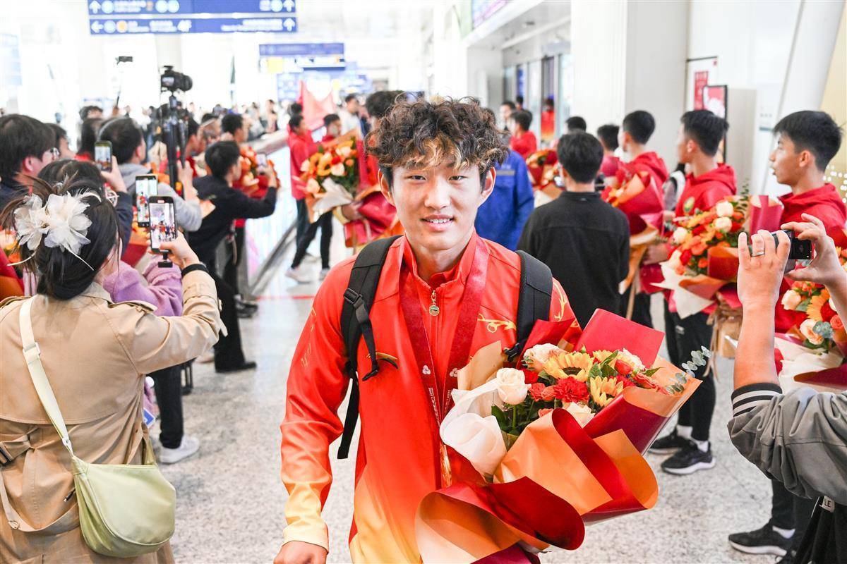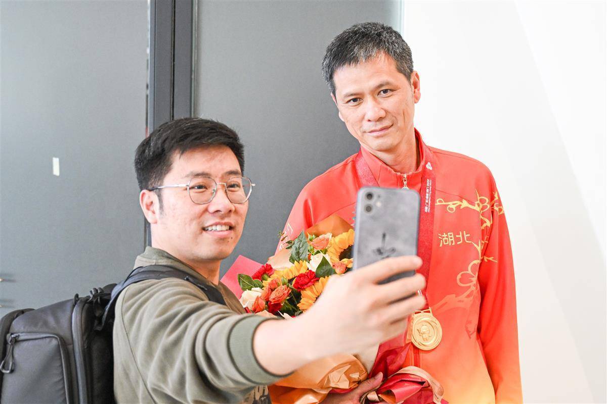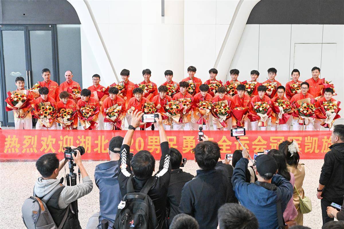11月13日下昼,湖北男足乘坐飞机回到武汉,在河汉机场,湖北足协举行接待典礼管待冠军回家!在11月12日的全运会U20男足决赛中,湖北队在点球大战中打败广东队夺冠。(湖北日报全媒记者 任勇 摄) 湖北队队员孙康博最初走出机场出口。在11月12日全运会U20男足决赛中,孙康博凭借临了时分的宇宙波将比分扳平,成效扭转“战局”。(湖北日报全媒记者 任勇 摄)