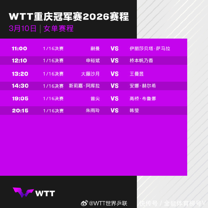 北京时候3月10音信,2026年WTT重庆冠军赛今天雅致开赛,CCTV5、CCTV5+直播比赛实况。今天的男女队的第一轮,将有王曼昱、蒯曼、周启豪、黄友政、温瑞博等5名选手出战。其中,王曼昱迎战日本选手大藤沙月(13:20),周启豪与黄友政献技德比战(11:35)。今天,张本智和迎战瑞典名将卡尔伯格,颠倒有可能“一轮游”。